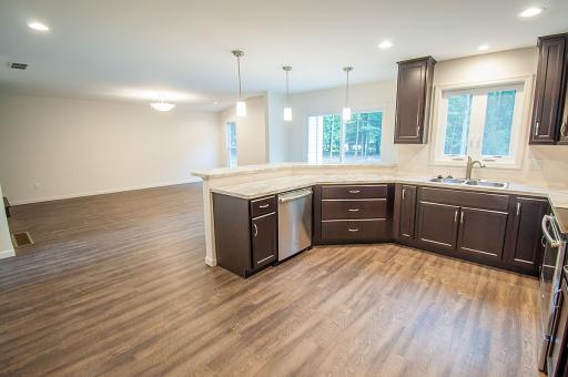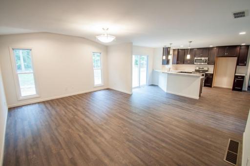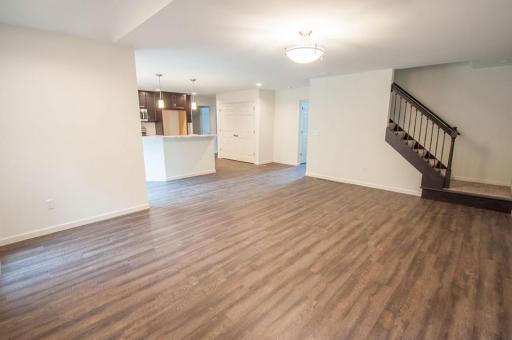 Our most popular 2 story, The Covington features formal living & dining room, family room, large kitchen with island and breakfast bar, open foyer with overlook, and master suite with walk in closet. Shown with OPTIONAL front elevation with stone columns and shake siding in gables.